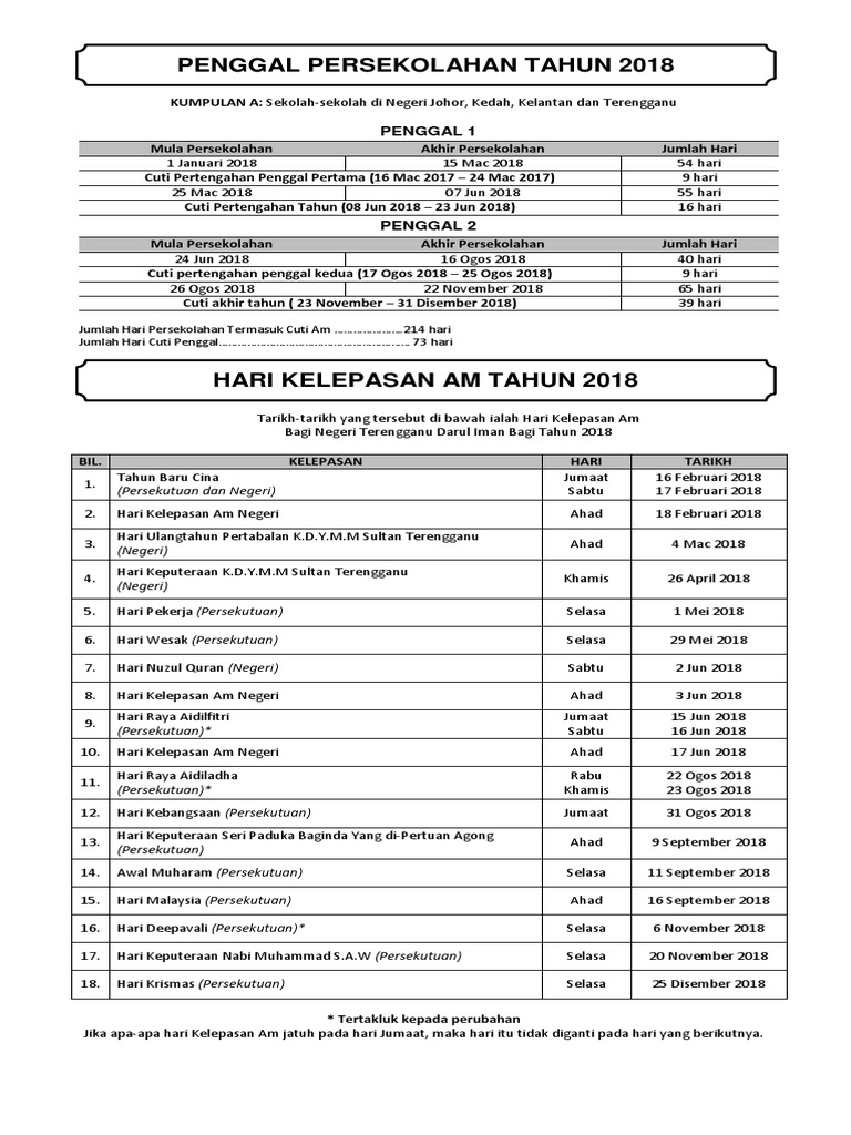 Kuala lumpur, putrajaya, johor, kedah, negeri sembilan, perak, pulau pinang dan. Kalendar perincian senarai tarikh cuti umum di malaysia hari kelepasan am negeri dan lampiran kalendar kuda serta jadual perincian hari kelepasan am persekutuan dan negeri tahun 2020. Cprc (crisis preparedness and response centre) kedah waktu operasi hari bekerja : Penjadualan cuti persekolahan terbahagi kepada dua. Hari kelepasan am tarikh (negeri kelantan). Dikemaskini pada 9 dis 2020: Enjoy public holiday 2015 malaysia! Jadual hari kelepasan am persekutuan 2018. Hari kelepasan am negeri perak darul ridzuan tahun 2014 cuti am mengikut urutan tarikh peristiwa tarikh hari tahun baru 2014 1 januari 2014 rabu maulidur rasul 14 januari 2014 selasa hari thaipusam 17 januari 2014 jumaat tahun baru cina 31 januari & 1. I am mother, traveler and travel blogger. Աստերիքս ու կախարդական ըմպելիքի գաղտնիքը 2018/մուլտ/հայերեն/6+. The malaysia public holidays 2018 calendar (jadual hari kelepasan am persekutuan & negeri 2018) below is useful for your next holiday trip planning and you have no more excuse not to buy overseas flight tickets during next airasia free seats / zero fares promotion. Viral!!!majikan minta tiap hari wik wik.